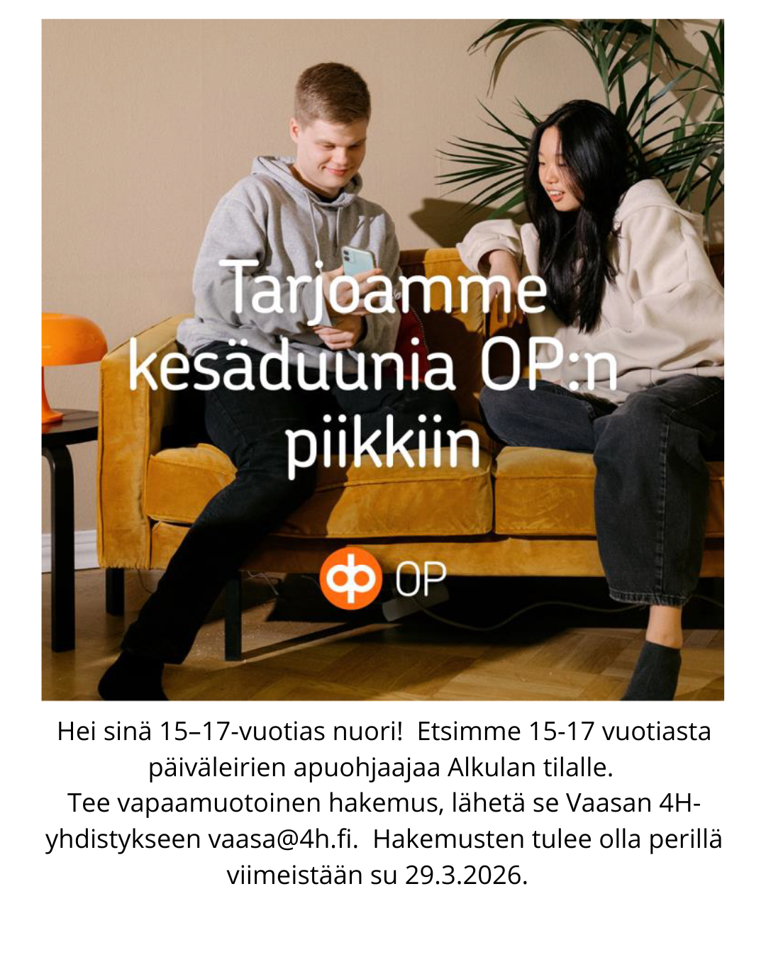 Tehtävänkuvaus | Nuori toimii Vaasan 4H yhdistyksen alakouluikäisille lapsille järjestettävien päiväleirien apuohjaajana. Leireillä leikitään, liikutaan, askarrellaan ja kokkaillaan. Työnkuvaan voi kuulua myös eläinten hoitoa ja puutarhatöitä. |